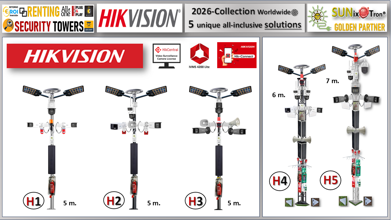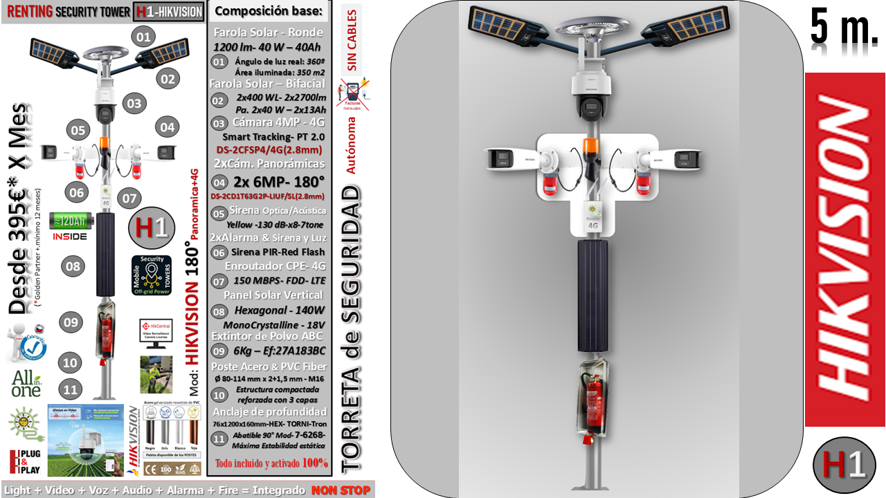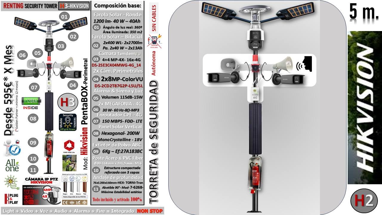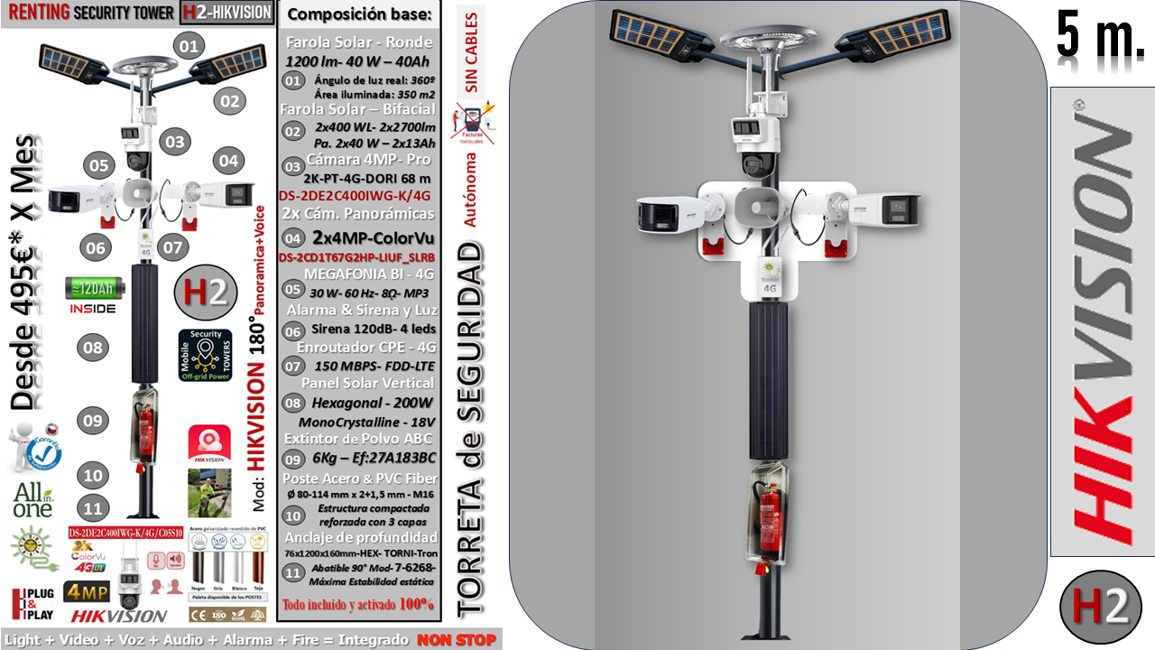 (CLICK AQUÍ PARA ABRIR) Cámaras de la última gama de HIKVISION en POSTES MOVIBLES de 5 metros de Altura, con dispositivos de acción directa y Equipos profesionales para ofrecer un conjunto de UTILIDADES que permitan PREVENIR + DISUADIR + CONTROLAR 24/7 cualquier tipo de áreas y zonas concretas. Incorpora un Extintor profesional para su uso en...