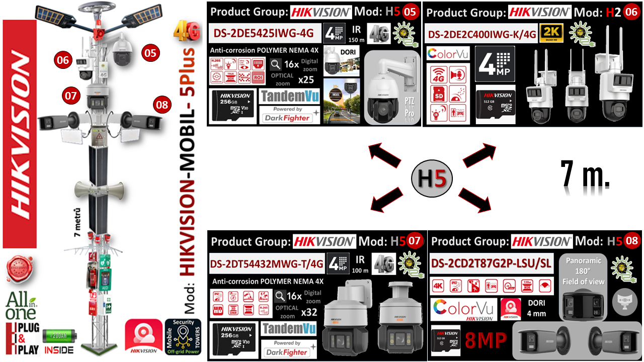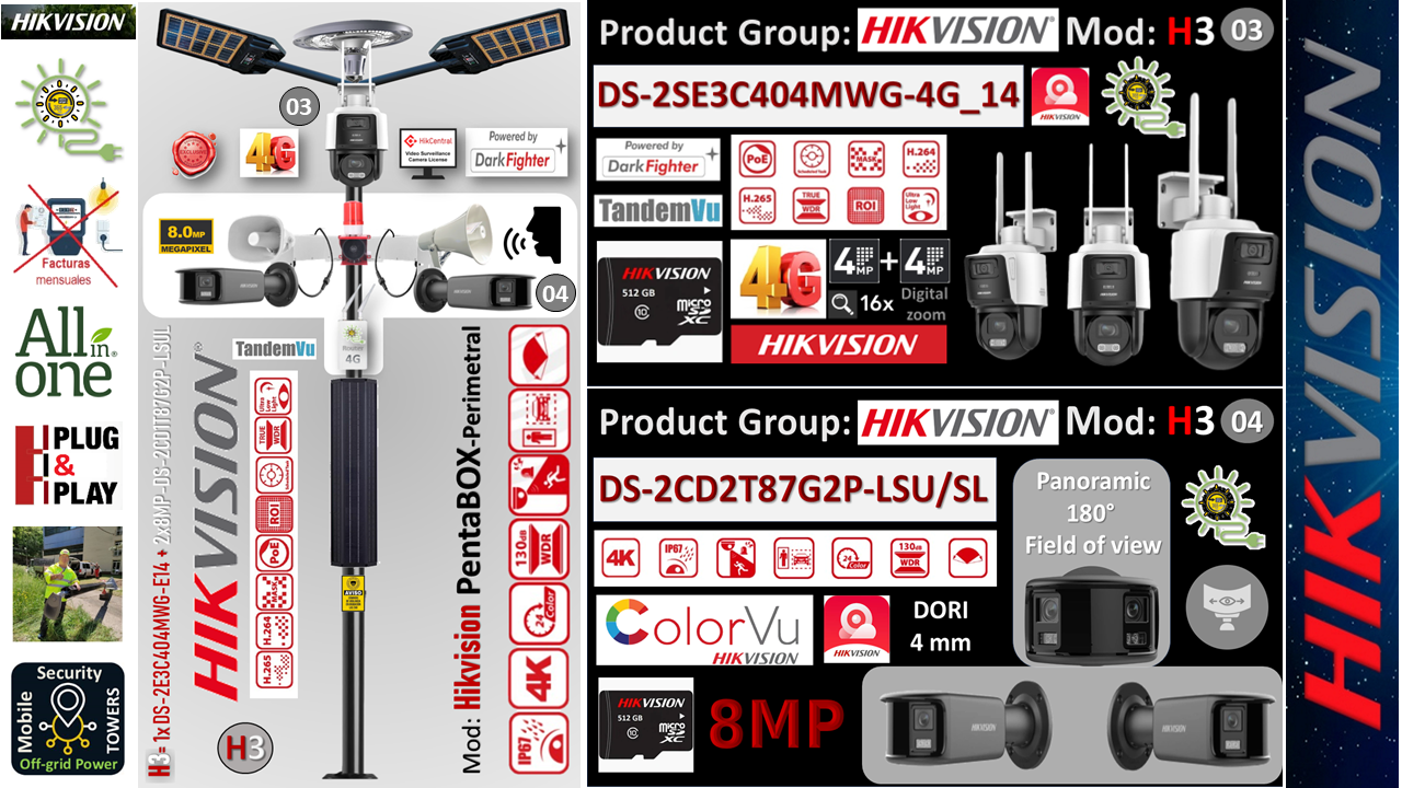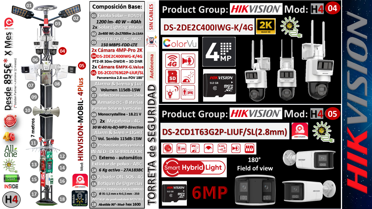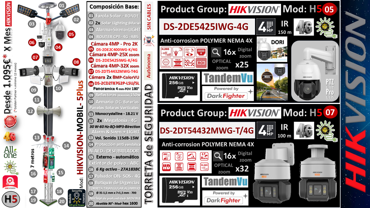 (CLICK AQUÍ PARA ABRIR) Cámaras de la última gama de HIKVISION en POSTES MOVIBLES de 5 metros de Altura, con dispositivos de acción directa y Equipos profesionales para ofrecer un conjunto de UTILIDADES que permitan PREVENIR + DISUADIR + CONTROLAR 24/7 cualquier tipo de áreas y zonas concretas. Incorpora un Extintor profesional para su uso en...