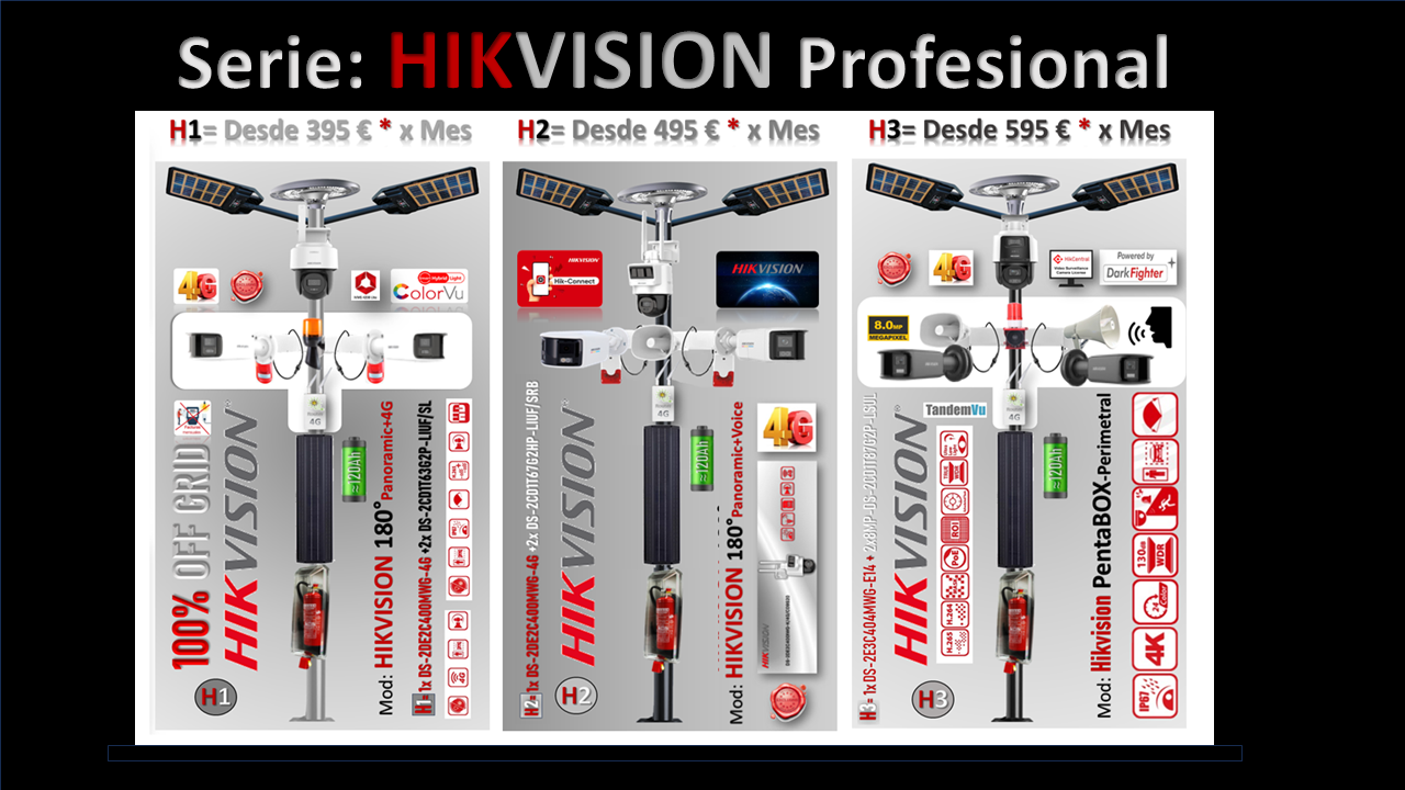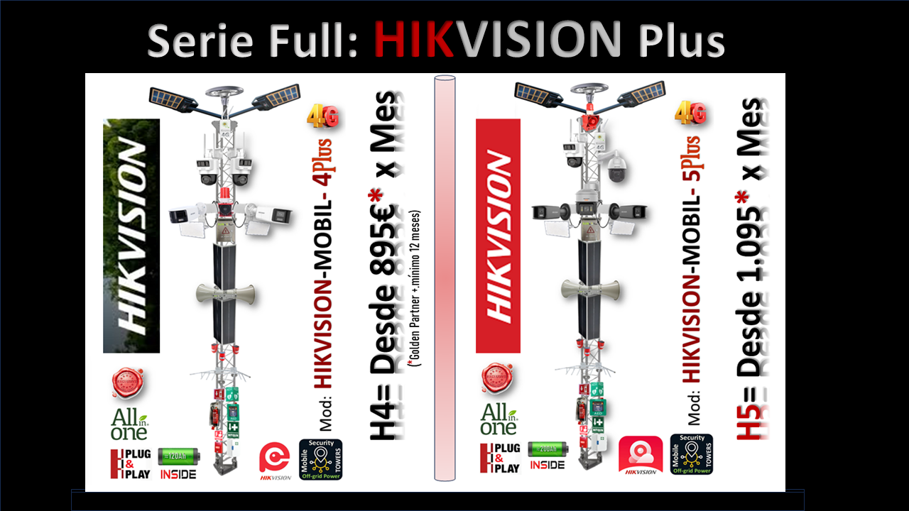 (CLICK AQUÍ PARA ABRIR) Cámaras de la última gama de HIKVISION en POSTES MOVIBLES de 5 metros de Altura, con dispositivos de acción directa y Equipos profesionales para ofrecer un conjunto de UTILIDADES que permitan PREVENIR + DISUADIR + CONTROLAR 24/7 cualquier tipo de áreas y zonas concretas. Incorpora un Extintor profesional para su uso en...