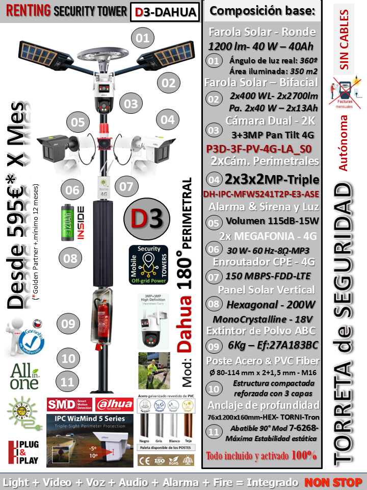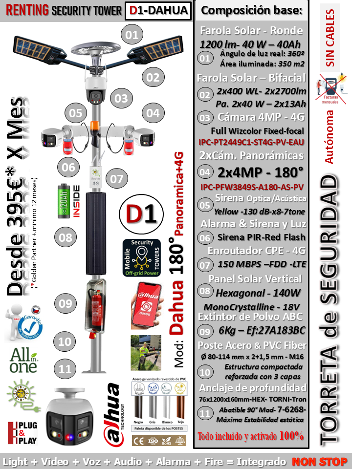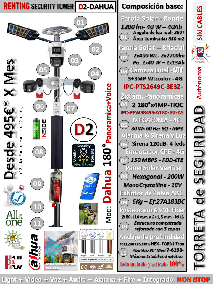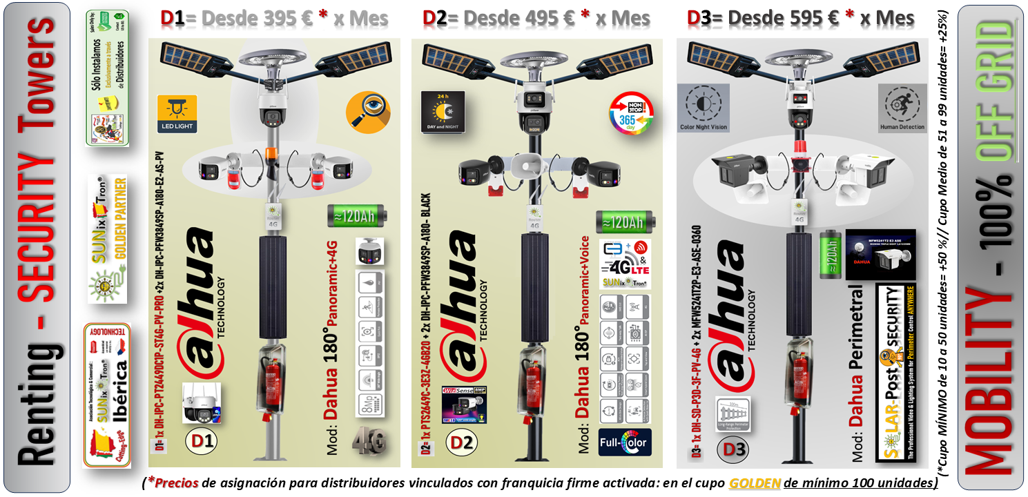 (CLICK AQUÍ PARA ABRIR) Cámaras de la última gama de DAHUA en POSTES MOVIBLES de 5 metros de Altura, con dispositivos de acción directa y Equipos profesionales para ofrecer un conjunto de UTILIDADES que permitan PREVENIR + DISUADIR + CONTROLAR 24/7 cualquier tipo de áreas y zonas concretas. También incorpora en la base un Extintor profesional para su uso en caso de EMERGENCIA.