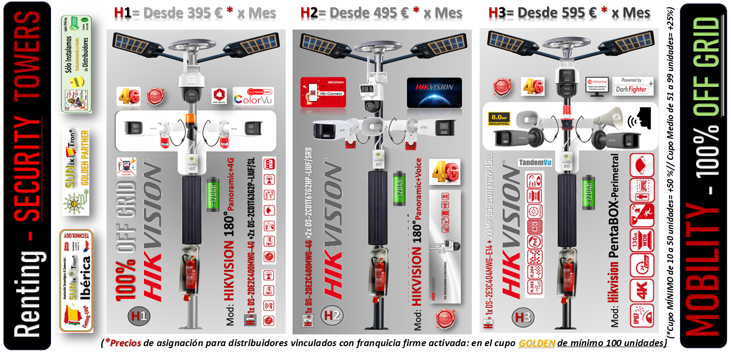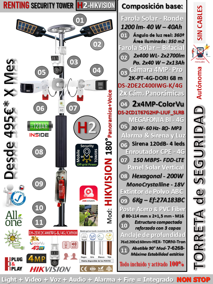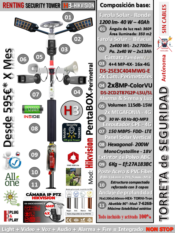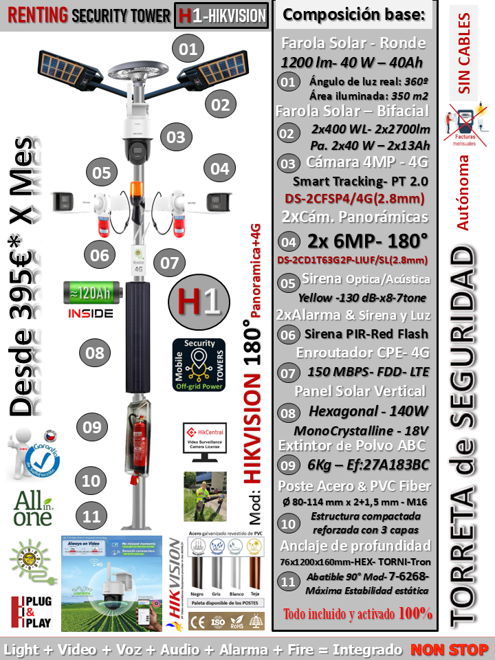 (CLICK AQUÍ PARA ABRIR) Cámaras de la última gama de HIKVISION en POSTES MOVIBLES de 5 metros de Altura, con dispositivos de acción directa y Equipos profesionales para ofrecer un conjunto de UTILIDADES que permitan PREVENIR + DISUADIR + CONTROLAR 24/7 cualquier tipo de áreas y zonas concretas. Incorpora un Extintor profesional para su uso en caso de EMERGENCIA.