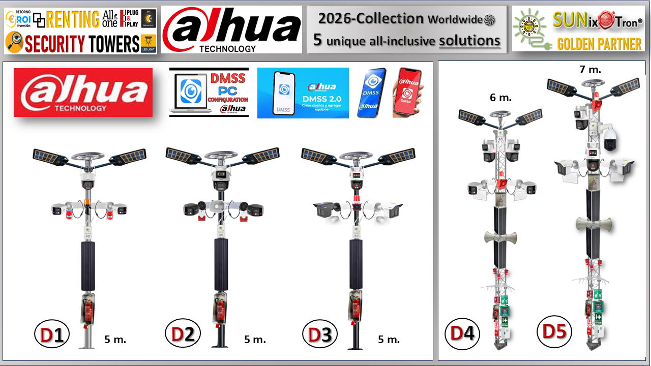 (CLICK AQUÍ PARA ABRIR) Cámaras de la última gama de DAHUA en POSTES MOVIBLES de 5 metros de Altura, con dispositivos de acción directa y Equipos profesionales para ofrecer un conjunto de UTILIDADES que permitan PREVENIR + DISUADIR + CONTROLAR 24/7 cualquier tipo de áreas y zonas concretas. También incorpora en la base un Extintor profesional para...