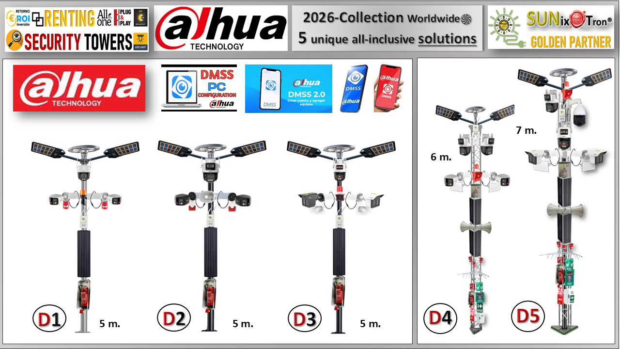 (CLICK AQUÍ PARA ABRIR) Cámaras de la última gama de DAHUA en POSTES MOVIBLES de 5 metros de Altura, con dispositivos de acción directa y Equipos profesionales para ofrecer un conjunto de UTILIDADES que permitan PREVENIR + DISUADIR + CONTROLAR 24/7 cualquier tipo de áreas y zonas concretas. También incorpora en la base un Extintor profesional...